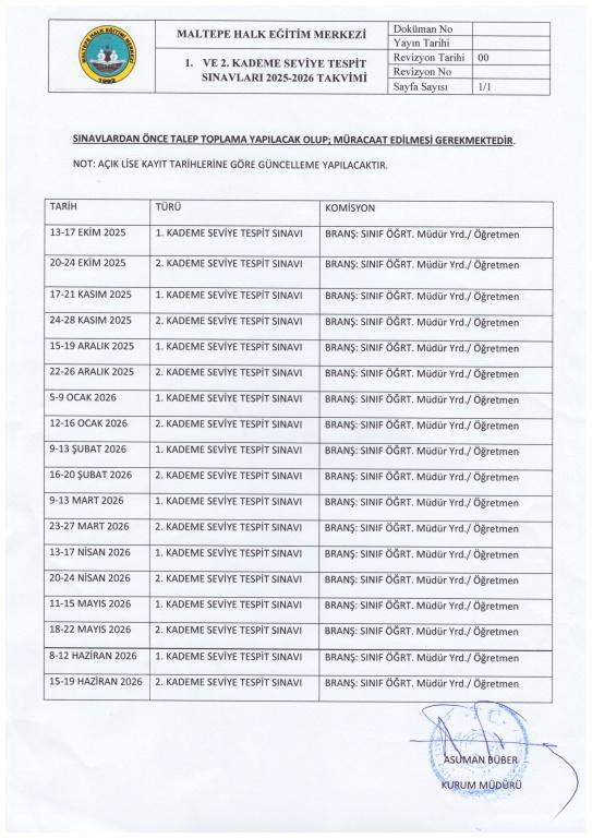 1. ve 2. Kademe Okuma - Yazma kursu seviye tespit sınavı tarihleri görselde ki gibidir. Açık Lise kayıtlarına göre güncellenecektir.